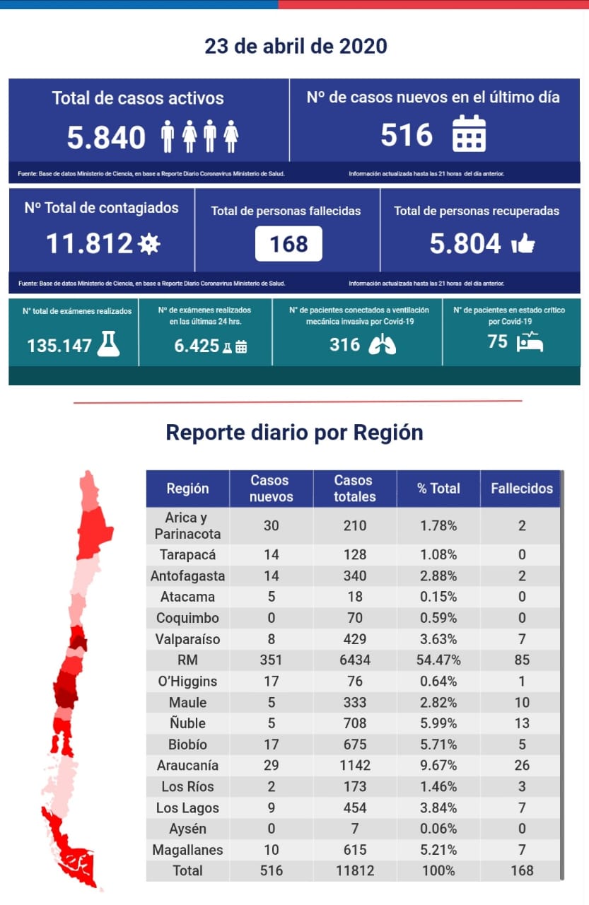 En el país, en al últimas 24 horas (hasta las 21 horas de ayer) se informan 516 casos nuevos, con un total de 11.812. De ellos el 49% ya están recuperados (5.804 personas).