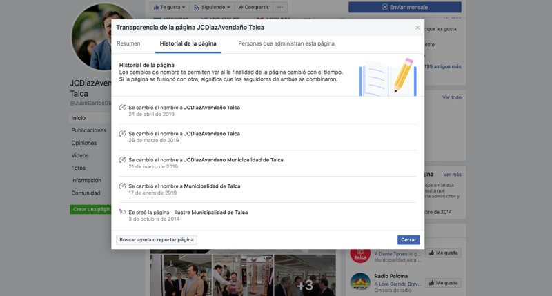 JCDiazAvendaño Talca, ese es el nuevo fanpage del alcalde de Talca, Juan Carlos Díaz. Lo curioso es que dicha página representa un caso único en la política local, pues el edil se apropió de la plataforma municipal, cambiándole el nombre cuatro veces desde enero de 2019 a la fecha, para lograr imponer su nombre en el sitio de Facebook.