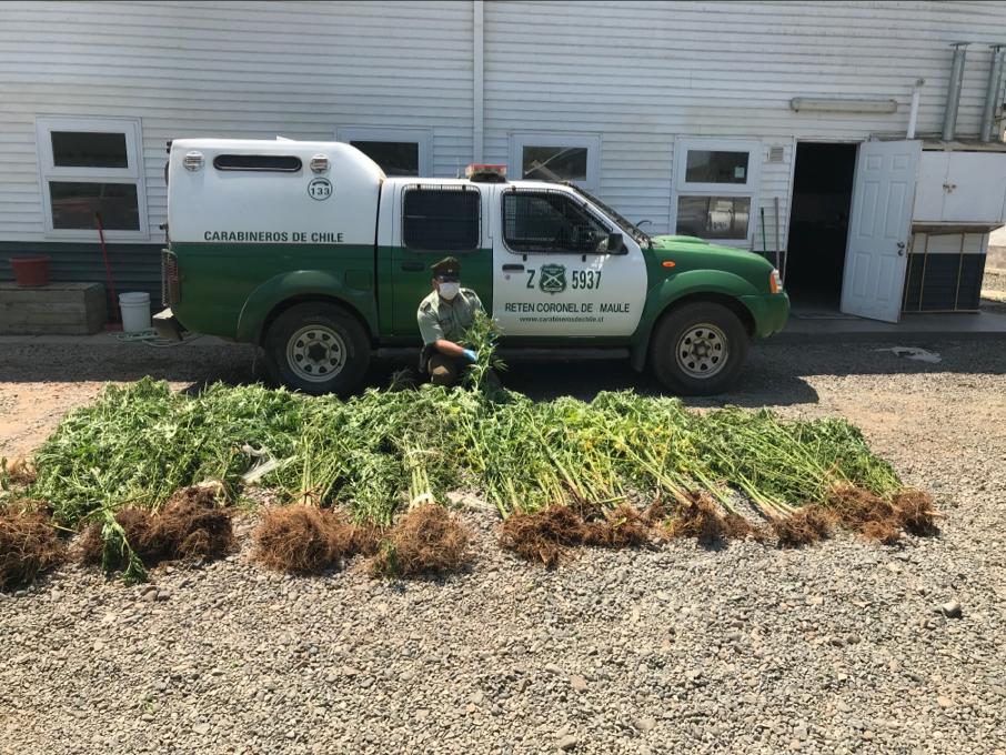 En horas de la tarde de este martes, personal de Carabineros del Retén de Coronel de Maule en base a investigaciones preliminares debido  denuncias interpuestas por vecinos, lograron detectar  una plantación ilegal de Cannabis Sativa en el sector de Pichihuedque. Debido a ello, y a las gestiones efectuadas por el contingente policial, se logró decomisar 366 plantas de Marihuana, las cuales se encontraban en proceso de crecimiento, fluctuando sus medidas entre 1.50 y 2.00 de altura, lo cual equivale a 292 mil 800 dosis sacadas de circulación; la droga incautada, fue remitida al Servicio de Salud del Maule.
