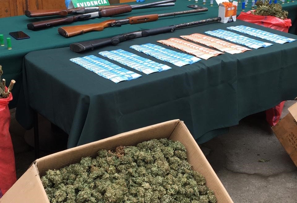 Los detenidos fueron identificados con las iniciales: M.E.B.V de 40 años; R.H.L.F de 44 años; J.A.C.S de 43 años; y J.E.L.V de 61 años. Además Carabineros incautó: 35 kilos de marihuana elaborada, una escopeta marca Winchester calibre 12 mm, una escopeta marca JAGD, una escopeta marca BAIKAL calibre 12 mm (con encargo por robo), además de 329 cartuchos calibre 12 mm y la suma de $2.309.000 en efectivo.