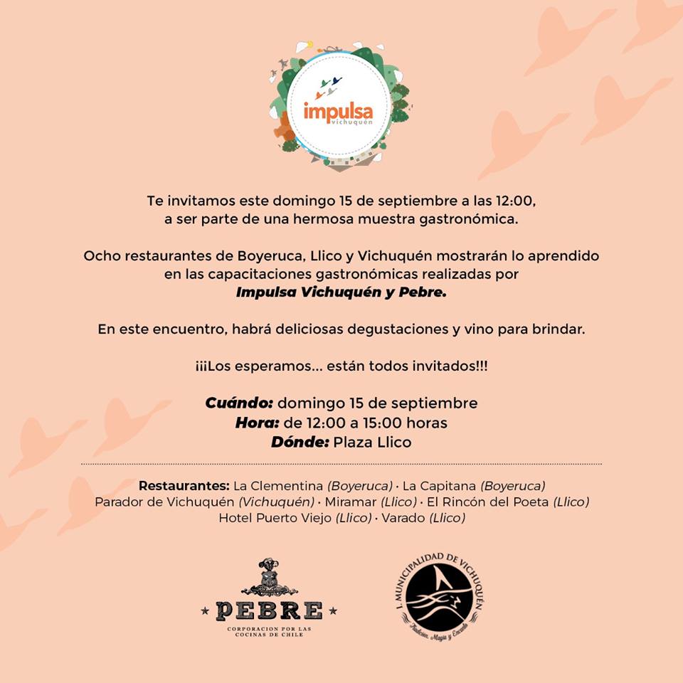 La iniciativa en su primera versión, es organizada por la fundación Impulsa Vichuquén, Corporación Pebre y la Municipalidad de Vichuquén y tendrá lugar en la Plaza de Llico el día 15 de septiembre de 12:00 a 15:00, con una amplia oferta gastronómica de la mano de los mejores restaurantes locales: La Clementina (Boyeruca), La Capitana (Boyeruca), Parador de Vichuquén (Vichuquén), Miramar (Llico), El Rincón del Poeta (Llico), Hotel Puerto Viejo (Llico) y Varado (Llico), quienes instalarán sus cocinerías en la plaza.