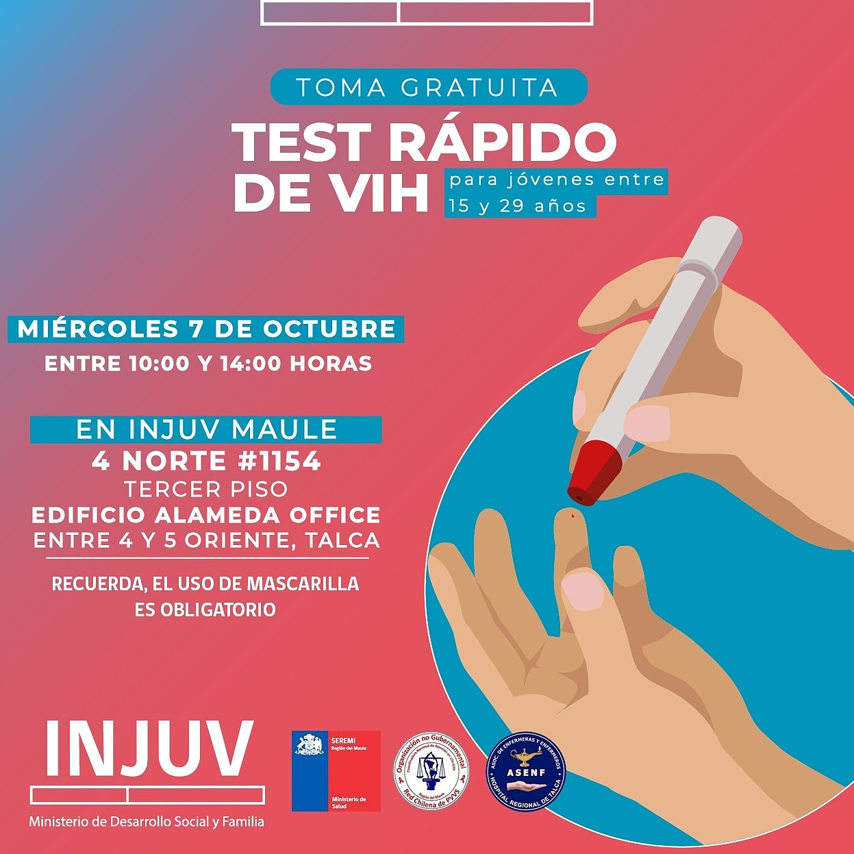El test rápido de VIH se realizará este 7 de octubre desde las 10:00 hasta las 14:00 horas en las oficinas del INJUV, ubicadas en la 4 norte #1154, tercer piso. Mientras que la toma de PCR será el 8 del mismo mes en el mismo horario.