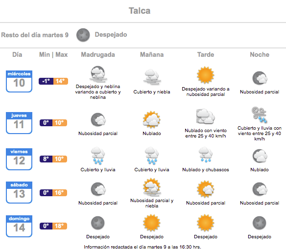 En Talca, también estará cubierto y con lluvia, y bajas temperaturas (entre 0 y 10ºC) entre jueves y viernes. De acuerdo a MeteoRed.cl en Talca caerán 36 mm. el jueves, y 17 mm. el viernes. Además se esperan vientos de hasta 40 km/h la noche del jueves.