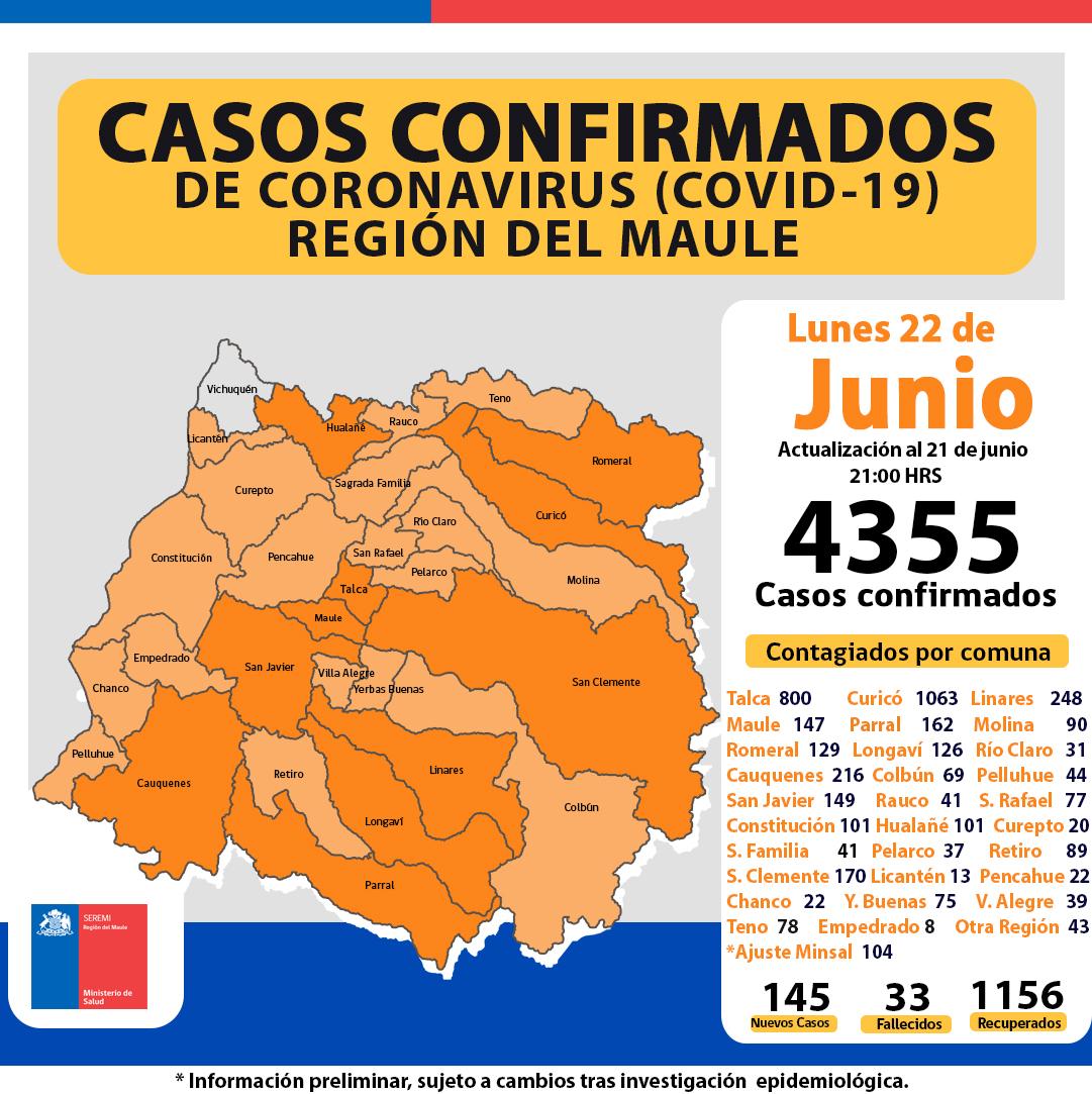 Tras los resultados entregados por la Seremi de Salud del Maule, se confirmaron 4.355 casos de COVID-19 en el Maule, teniendo 145 nuevos casos para el informe del 22 de junio.